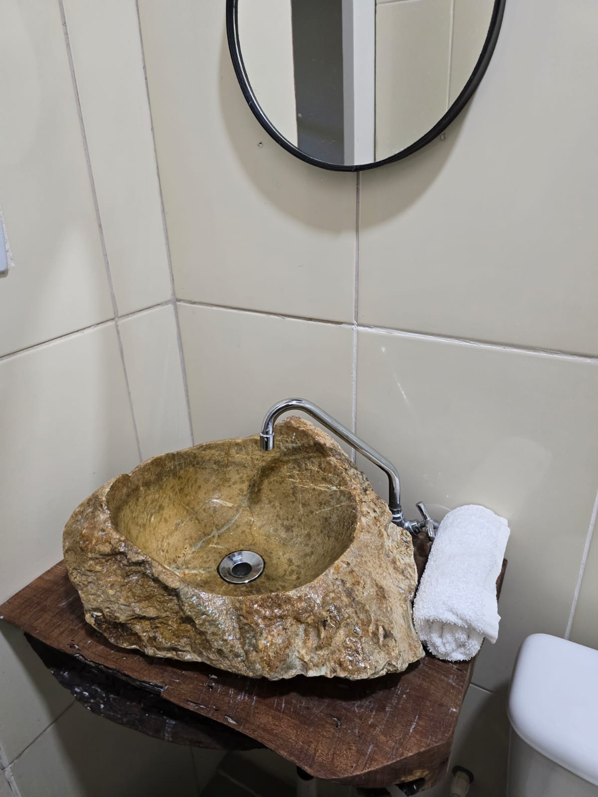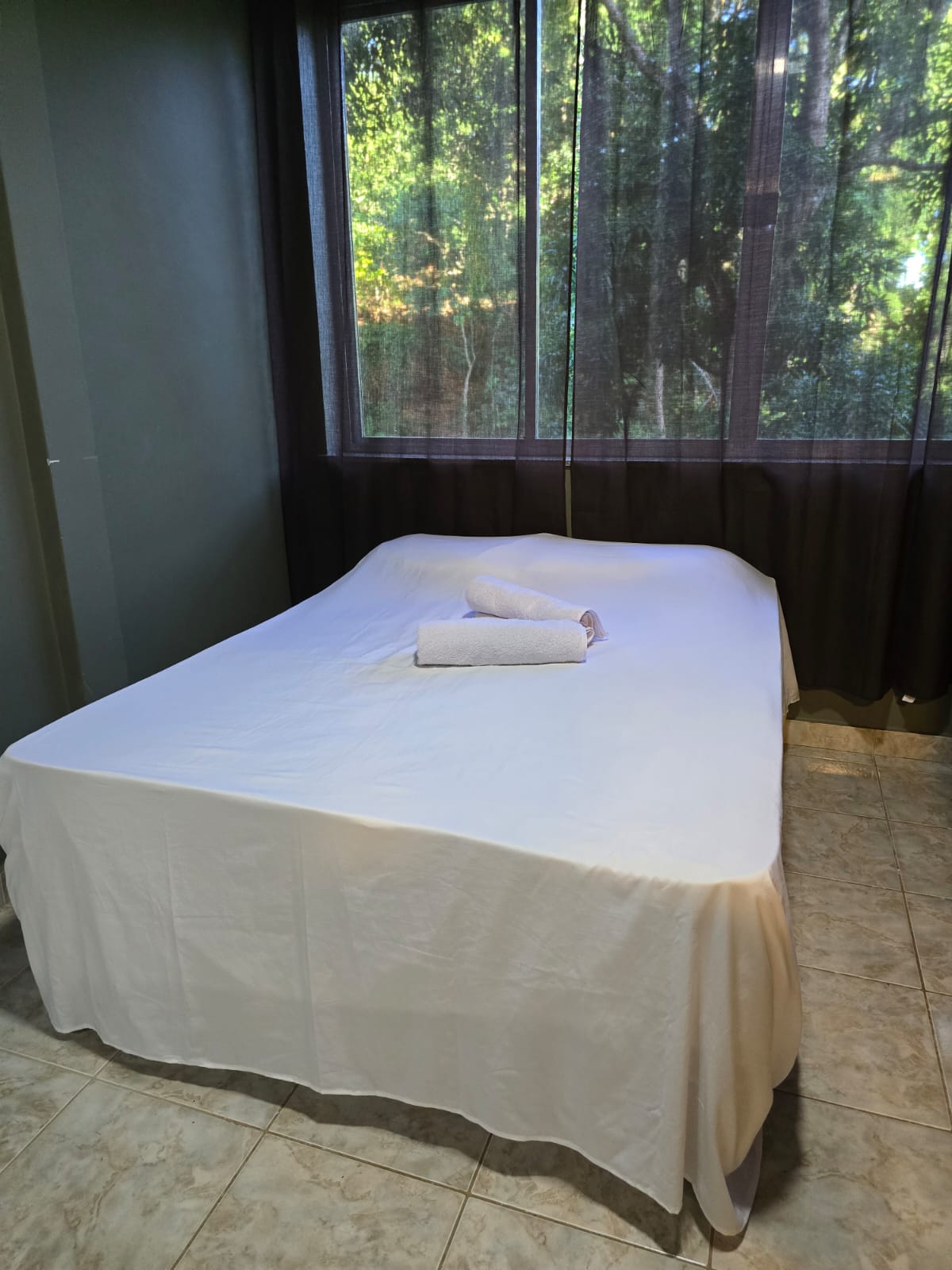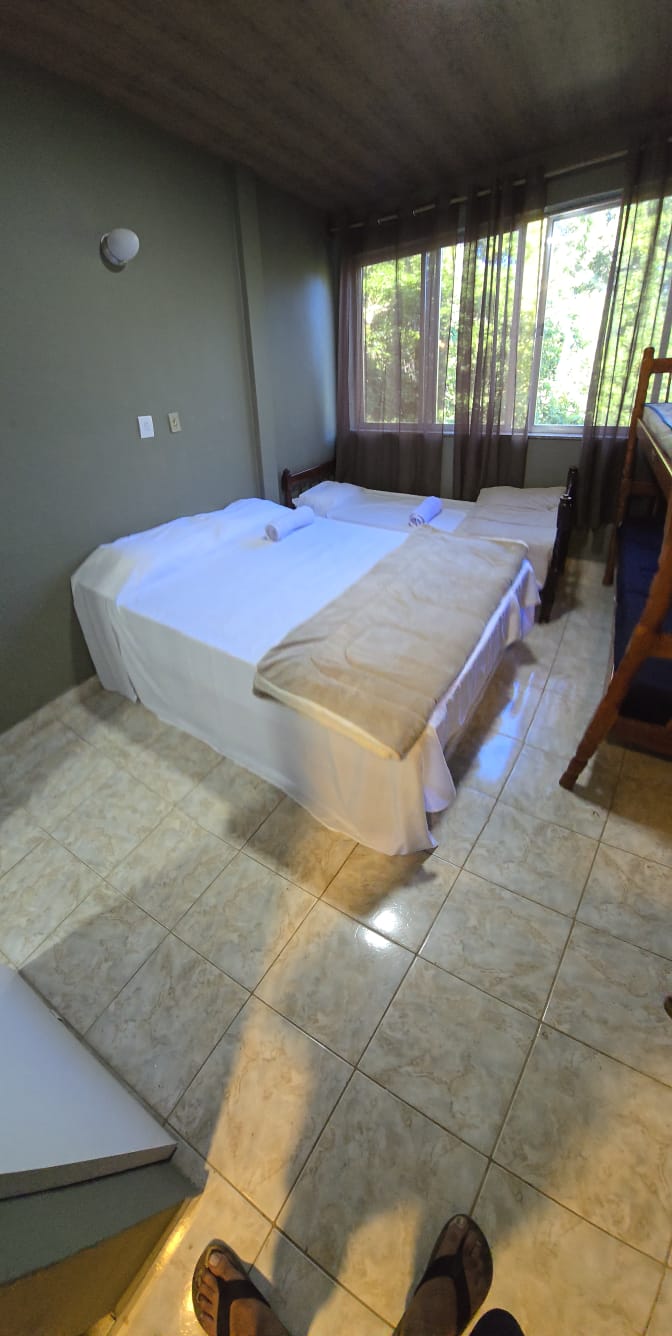 Oferecemos suítes confortáveis com ar condicionado, perfeitas para o seu descanso. Relaxe em um ambiente tranquilo e aconchegante, rodeado pela natureza.